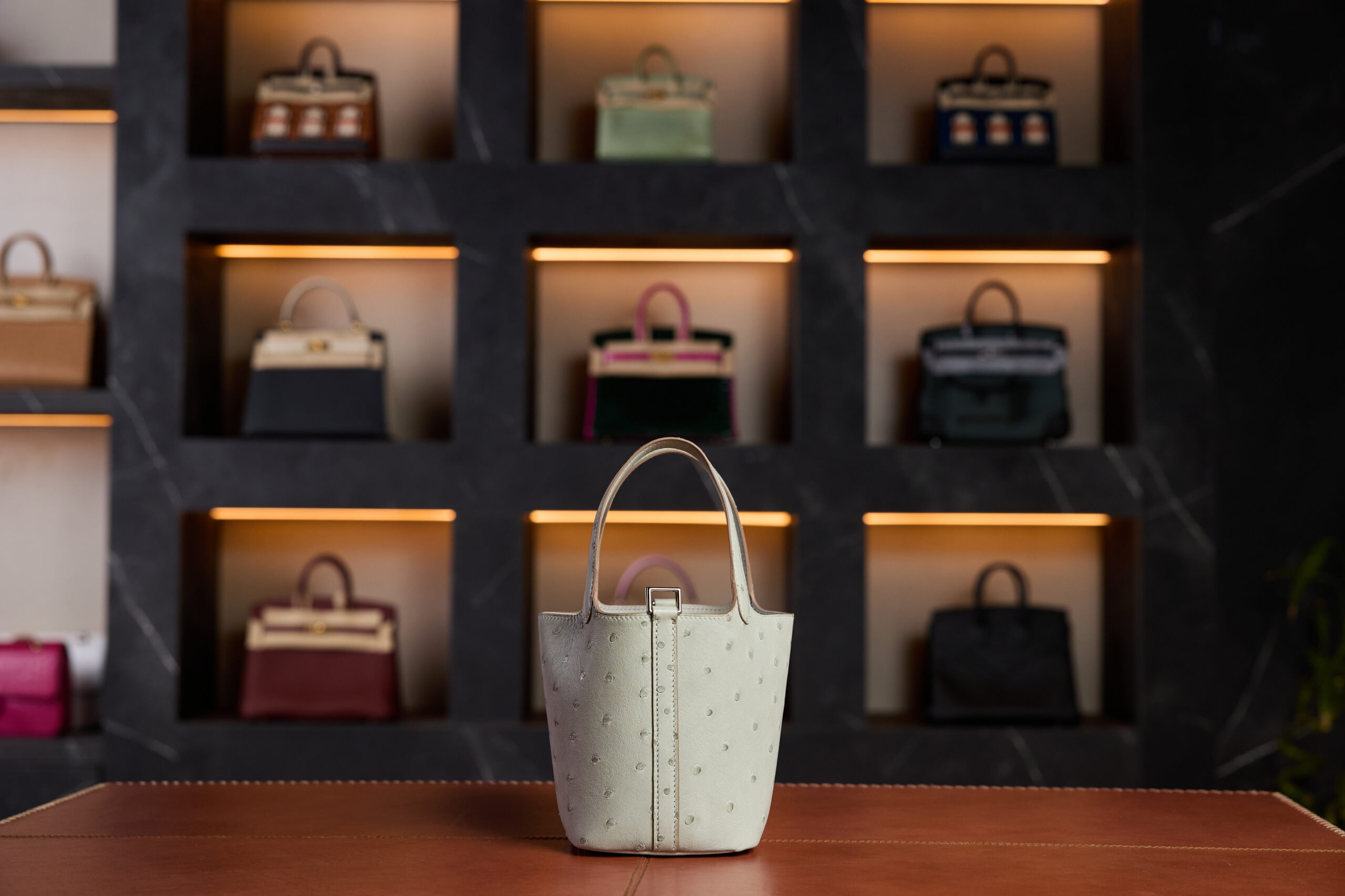 The Hermès Mini Picotin Gris Pale Ostrich (2023) redefines quiet luxury through simplicity and artisanal mastery. Crafted from exquisite Ostrich leather, this creation showcases the natural dotted texture of the exotic skin, soft to the touch yet remarkably durable.
