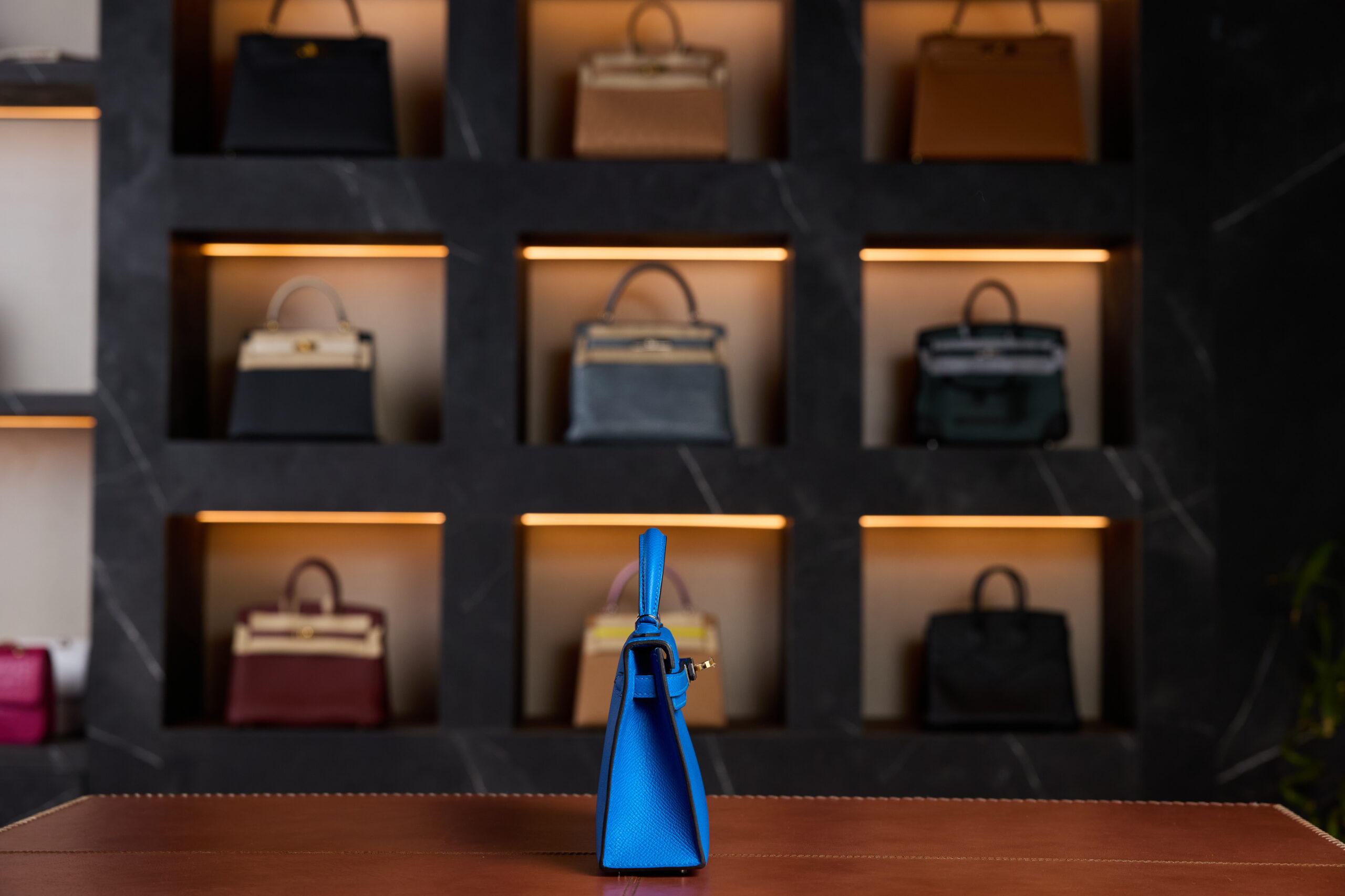 A luxurious black Hermès Birkin bag with palladium hardware and made with Horse Hair Troika displayed on a leather surface, set against a dark marble wall featuring a backlit collection of various Hermès handbags in different colors and materials.