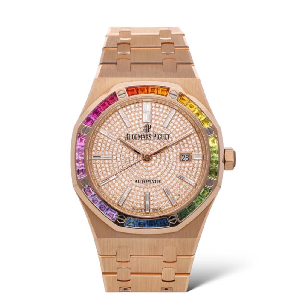 This luxurious timepiece is a stunning display of craftsmanship and extravagance. The 41mm case is crafted from 18kt rose gold and features the iconic octagonal Royal Oak design with an eye-catching rainbow set bezel. The bezel is adorned with vibrant sapphires, gradually changing color to create a spectacular spectrum across the watch face.